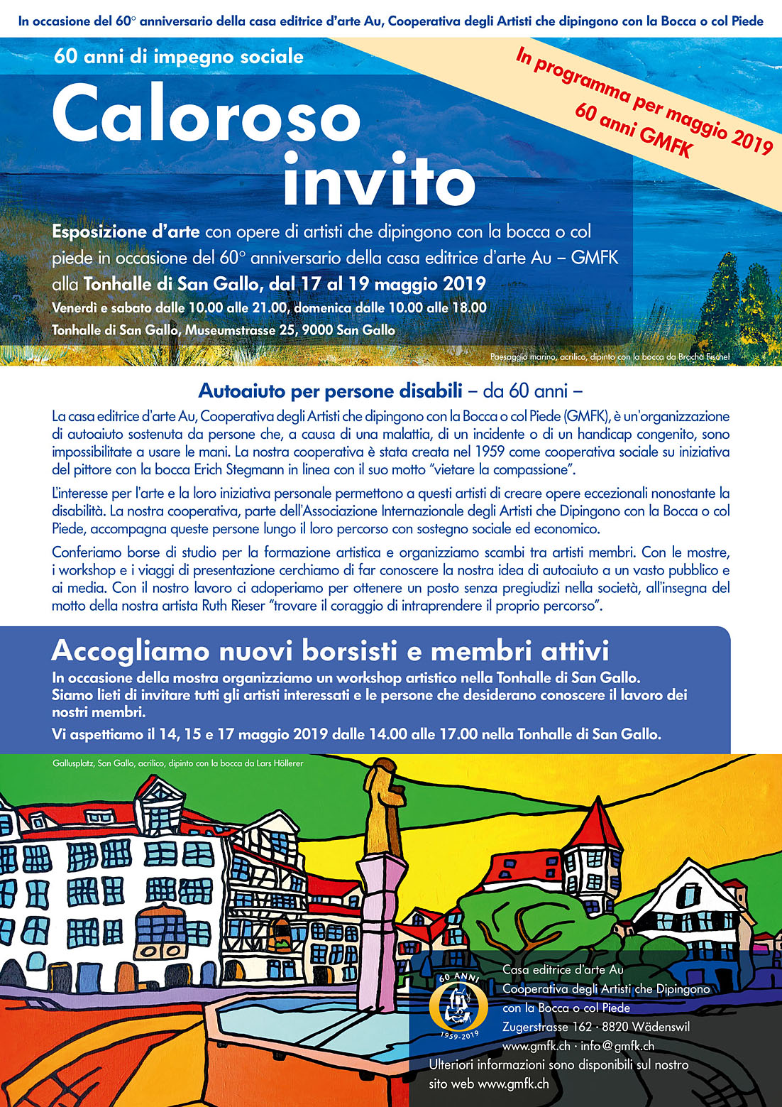 Arte straordinaria da persone straordinarie: da ormai 60 anni la casa editrice Kunstverlag Au, cooperativa di artisti che dipingono con la bocca o con i piedi (GMFK), offre sostegno in ambito sociale ed economico agli artisti con disabilità fisiche. Per promuovere lo scambio tra gli artisti stessi e con la società, la casa editrice organizza regolarmente mostre, workshop e conferenze itineranti. Con una mostra di tre giorni, seguita da un workshop per artisti, la casa editrice Kunstverlag festeggia a maggio il suo 60° anniversario. Dal 17 al 19 maggio 2019, nella Tonhalle di San Gallo saranno esposte numerose opere di artisti che dipingono con la bocca e con i piedi.